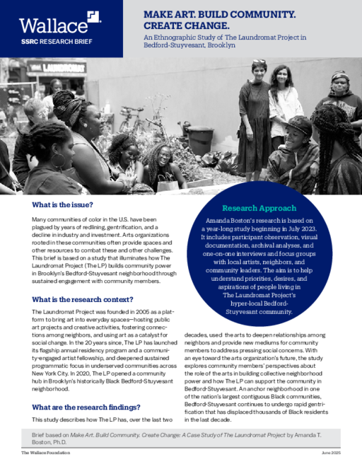 Many communities of color in the U.S. have been plagued by years of redlining, gentrification, and a decline in investment. Arts organizations rooted in these communities often provide spaces and other resources to combat these challenges. In this study, researcher Amanda T. Boston illustrates how, over the last two decades, The Laundromat Project (The LP) has used the arts to deepen relationships among neighbors and provided new ways for community members to address pressing social concerns.