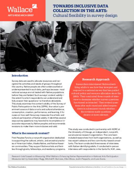 This brief is based on Measuring What Matters: Enhancing Native Representation in National Arts Participation Measures, by Gwendolyn Rugg, Mitchell R. Barrows, and Ellen Bloss at NORC; and Justin Pequeño and Lara Evans from First Peoples Fund.