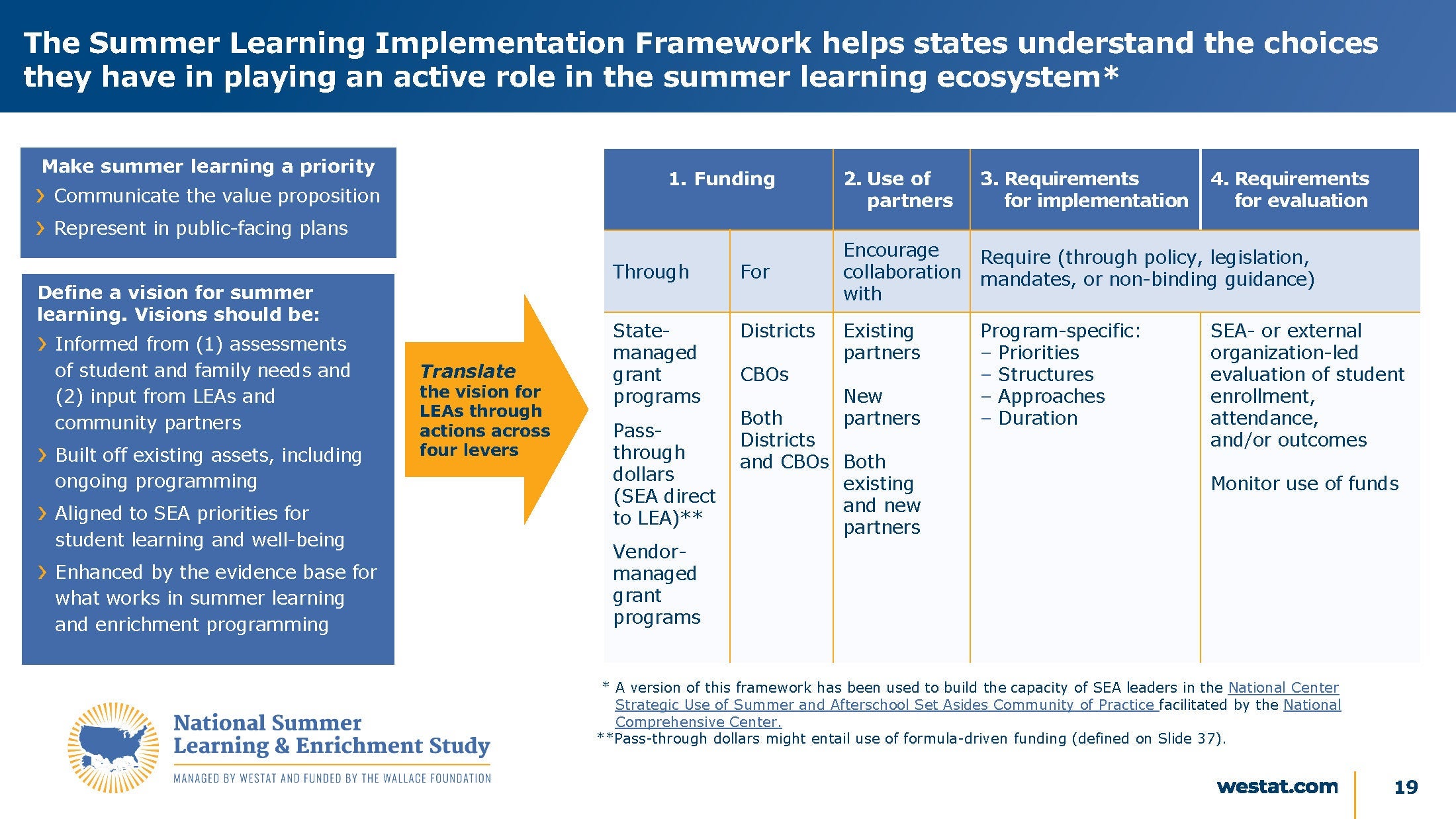 Of the state agencies interviewed, more than 80 percent developed a vision for summer learning and enrichment. States drew on assessments of student and family needs, school district and community partner input, existing assets, state priorities, and the summer learning research and evidence base to develop their visions. States generally approached their new role with summer learning by making it a priority, setting a vision, and deploying policy levers around funding, partnering, implementation, and evaluation.